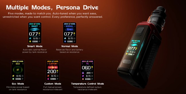 Unterstützt zahlreiche Dampfmodi: Smart, Eco, Normal, Custom (Curve), und Temperaturkontrolle (TC) – passe dein Dampferlebnis individuell an.