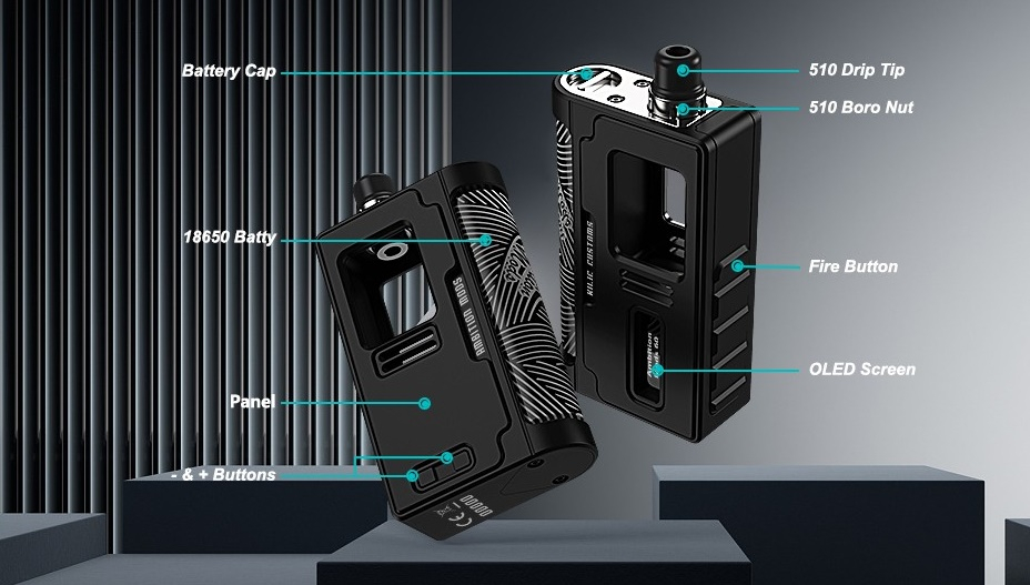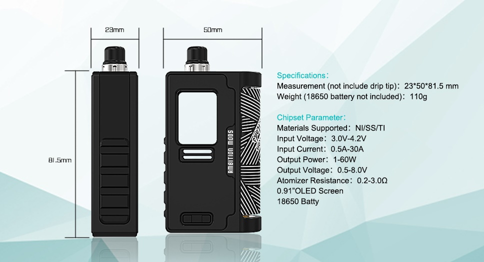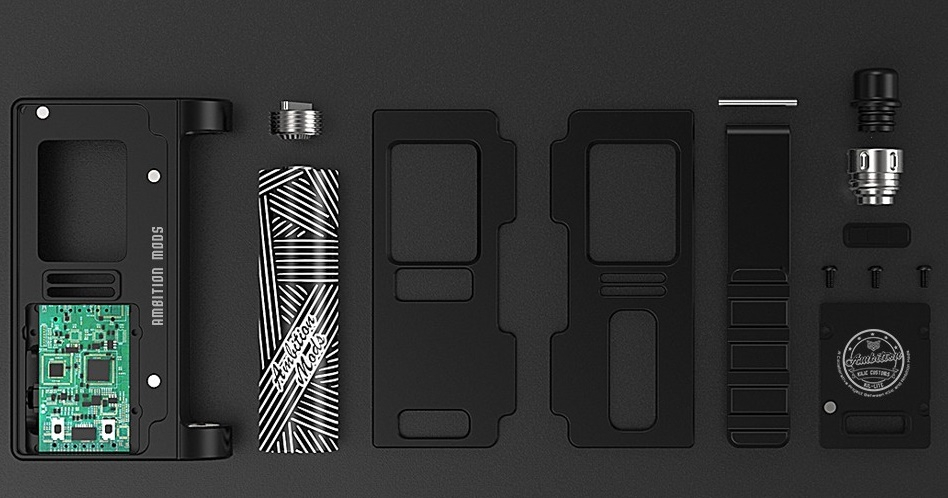 Ambition Mods hat in Zusammenarbeit mit Kilic Customs aus Malaysia die Kil-Lite AIO 60W auf den Markt gebracht. Die Ambition Mods Kil-Lite AIO 60W ist ein Akkuträger für Boro Tanks und Boro RBA Tanks, dadurch lassen sich eine Vielzahl von Verdampfern nutzen. Um den Akkuträger in betrieb nehmen zu können, muss erst mal ein 18650 Akku (nicht inbegriffen) von hinten eingeschoben und dann über die Fixierung von oben her fixiert werden. Da man bei diesem Prinzip den Akku jeweils sehen kann, legt Ambition Mods dem Kil-Lite Akkuträger noch passende Battery Wraps bei. Als Chip kommen beim Kil-Lite zwei verschiedene Versionen zum Einsatz: der proprietäre Chip von Ambition Mods oder der DNA60 von Evolv. In beiden Fällen liefert der Akkuträger eine Leistung von bis zu 60W im Watt Modus und unterstützt auch Temperaturkontrolle (Ni, Ti, SS).