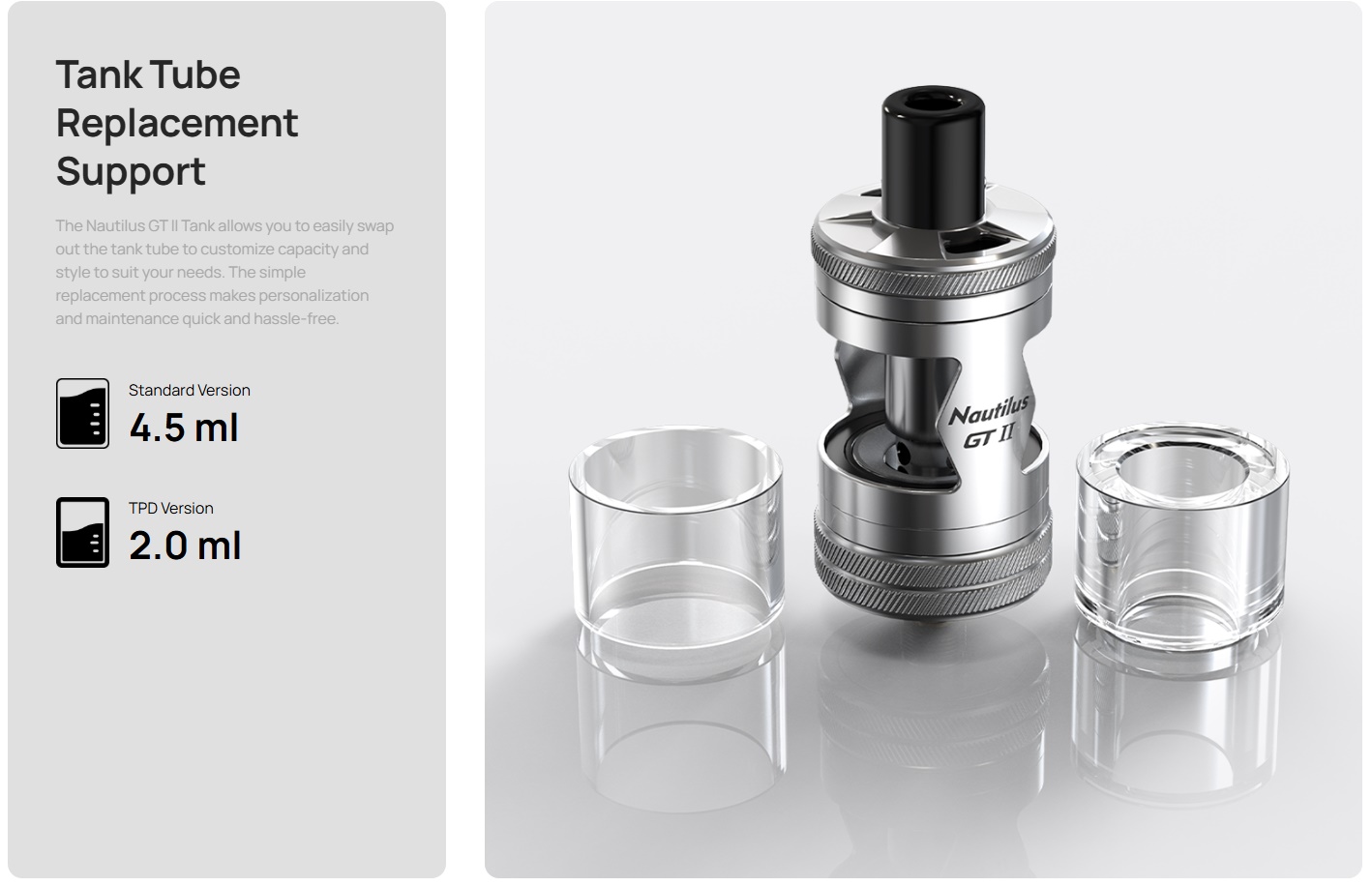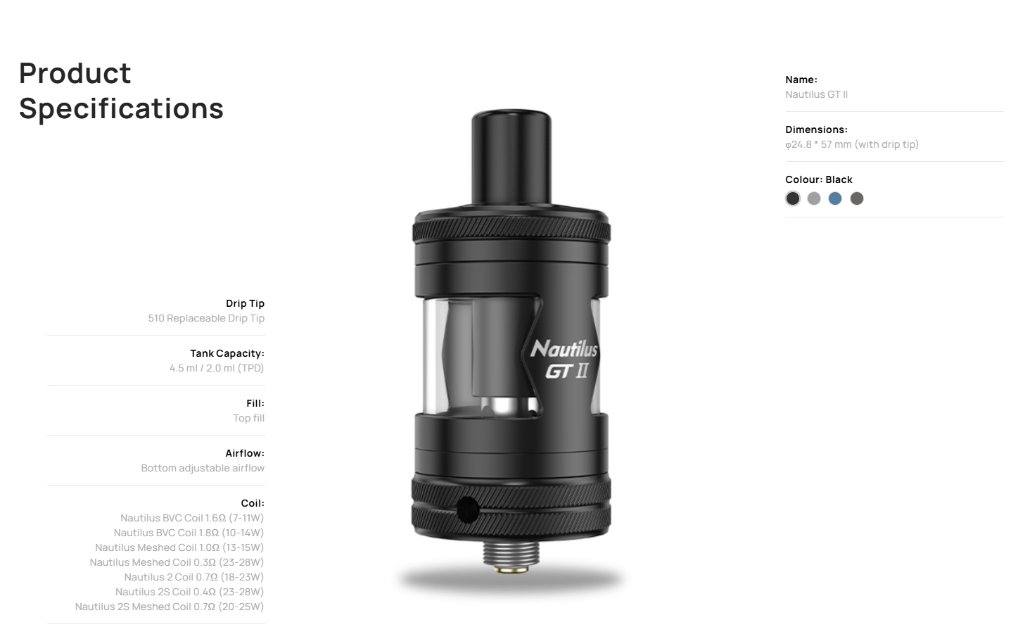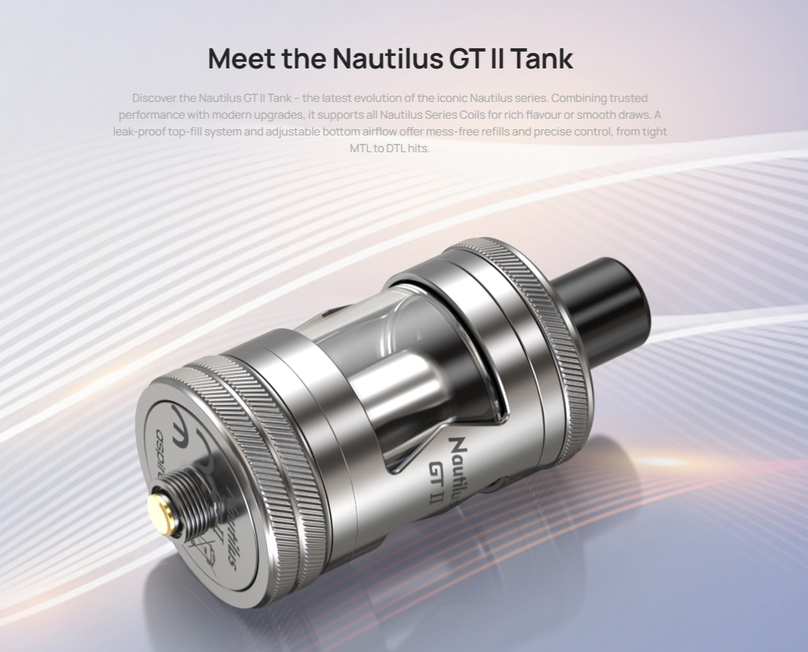 Der Aspire Nautilus GT2 ist der Nachfolger des Nautilus GT, welcher damals in Zusammenarbeit mit Smokerstore gemacht wurde. Der Nautilus GT2 jedoch wurde komplett durch Aspire entwickelt und verbindet Features der ersten Nautilus Tanks mit einem modernen und eleganten Designs. Der Aspire Nautilus GT2 hat ein Füllvolumen von 4,5ml und lässt sich dank des Top Filling schnell und einfach befüllen. Dazu muss das Top nur um 1/4 Umdrehung gedreht werden, schon kommen die grossen Öffnungen zum Vorschein. Der Nautilus GT2 hat einen Durchmesser von 24,8mm und passt auf eine Vielzahl von Akkuträger.