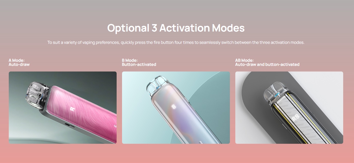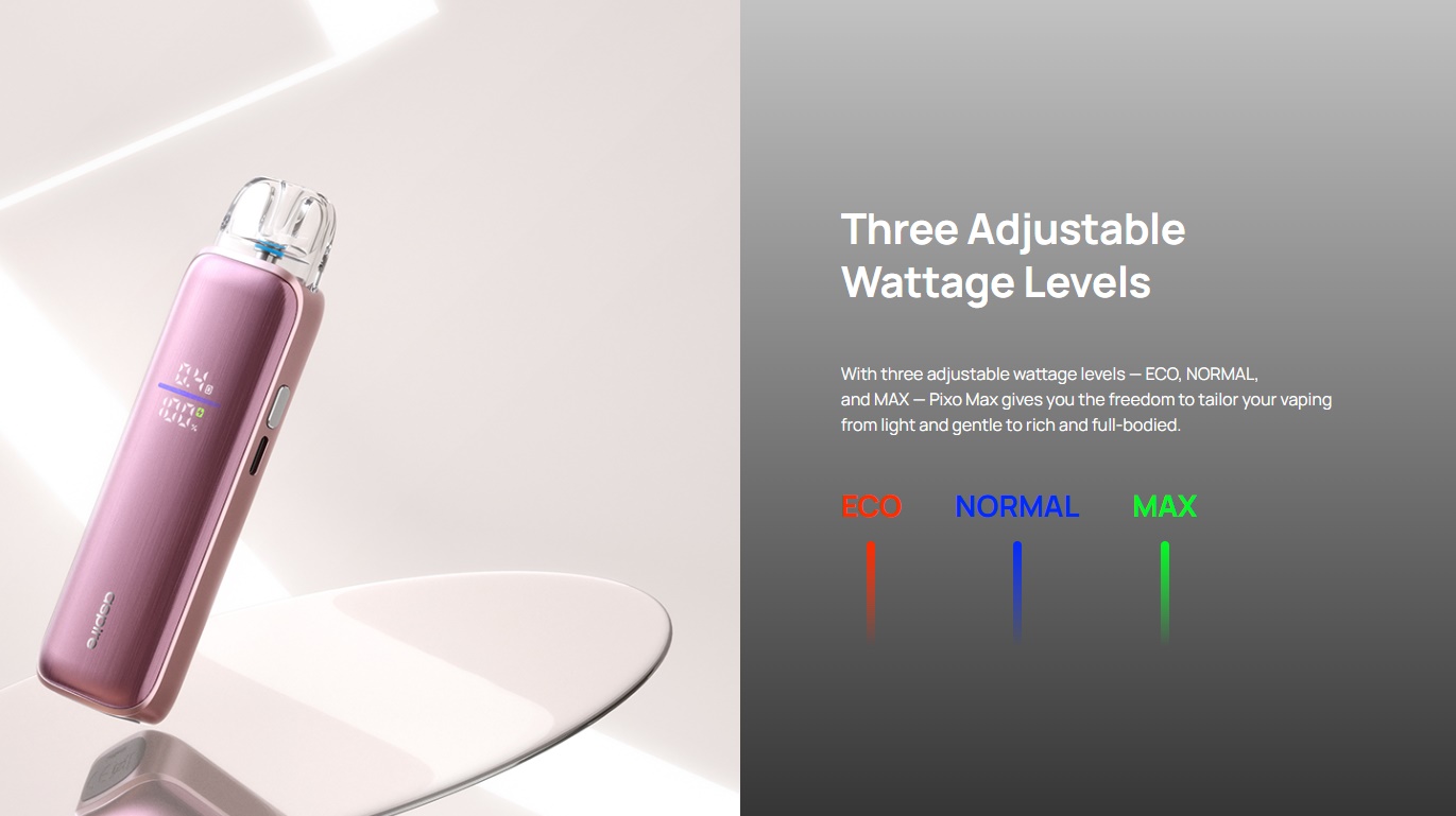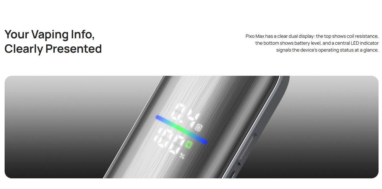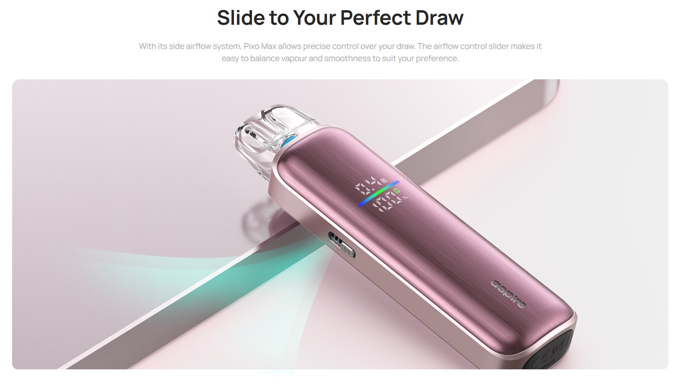 Im Gegensatz zum ersten Pixo verfügt der Pixo Max nicht über ein klassisches Display, sondern es kommt ein einfaches LED Display zum Einsatz, welches jeweils den Akkustand und den Widerstand anzeigt. Leistungsmässig bietet der Aspire Pixo Max 3 Stufen (Low, Medium, High) und wie bei den anderen Pixo Modellen kann auch beim Pixo Max zwischen Auto Draw, Button und Auto Draw/Button gewählt werden. An der Seite des Gerätes befindet sich der Slider zum einstellen der Airflow, dadurch kann man den Zugwiderstand ganz dem eigenen Geschmack nach anpassen.