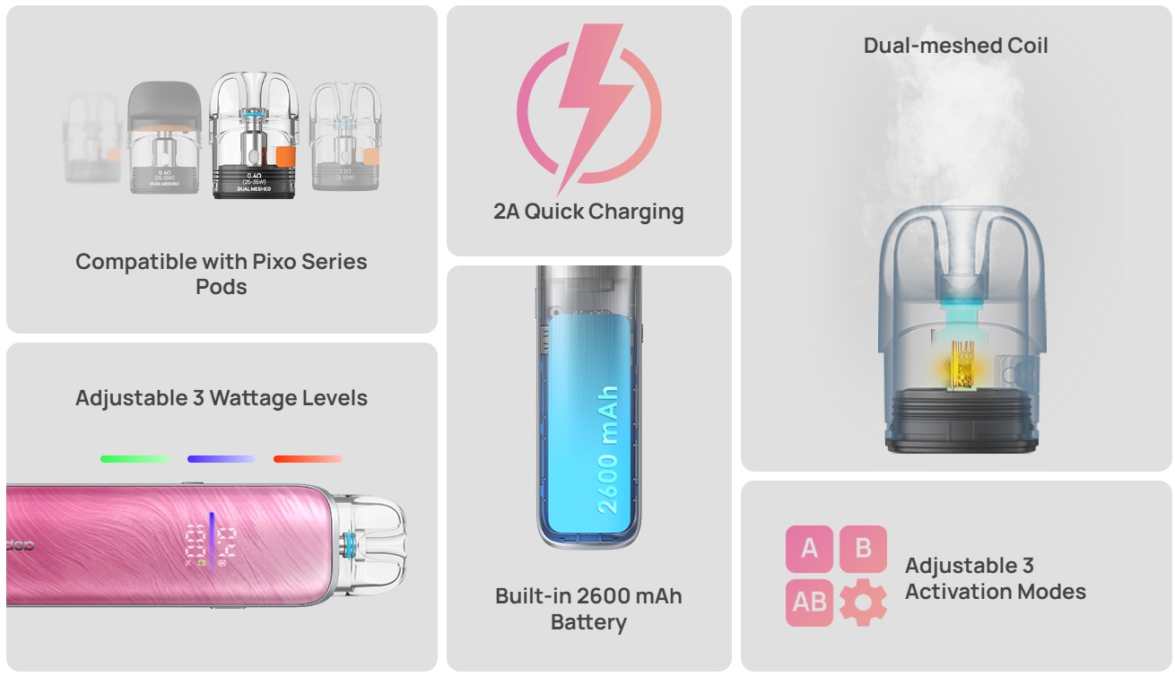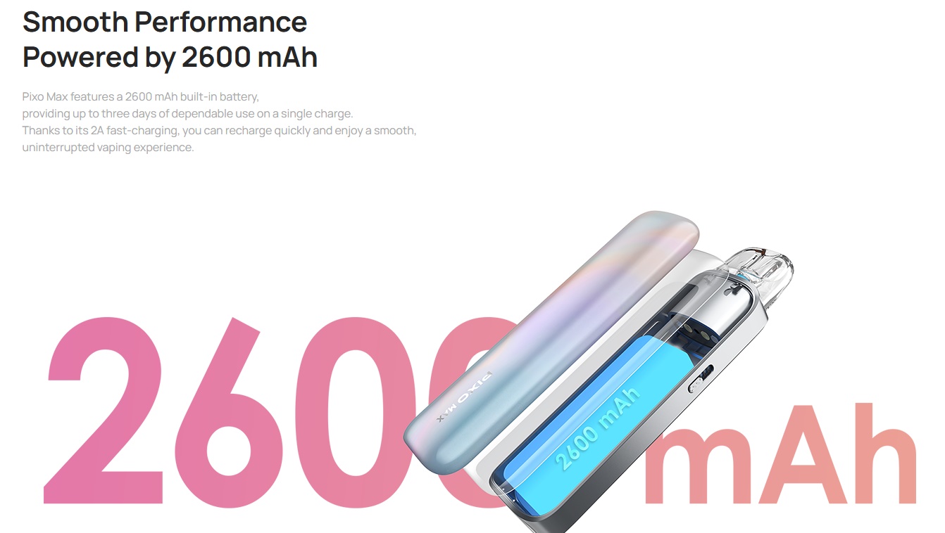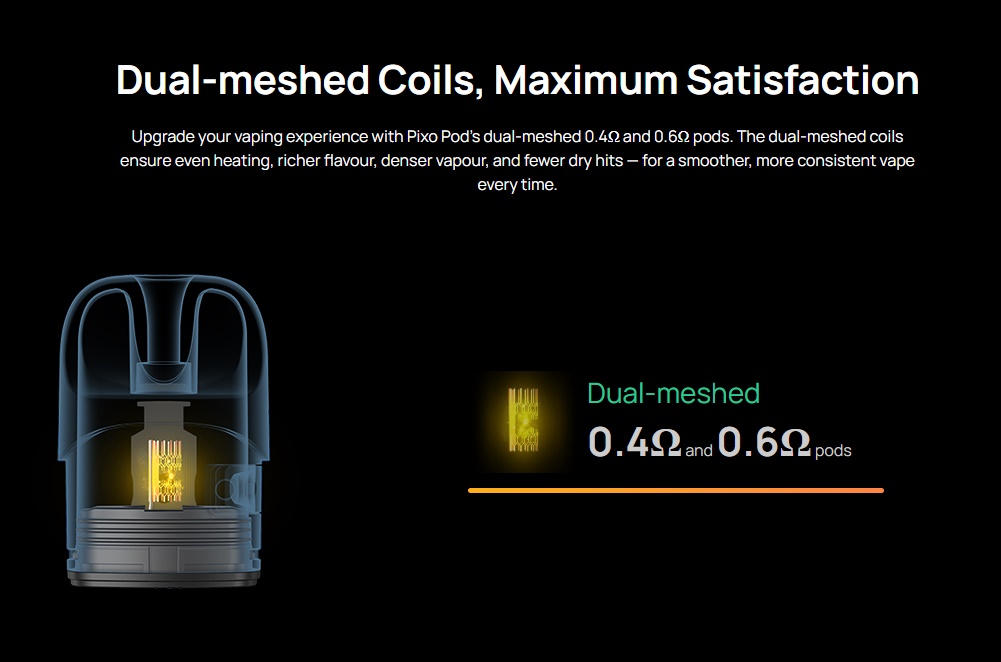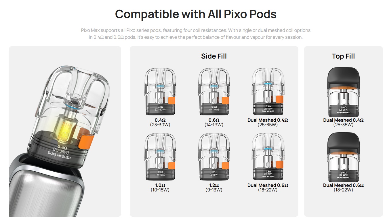 Der Aspire Pixo Max ist das neuste Modell in der Pixo-Reihe. Im Vergleich zu seinen Vorgängern wuchs der Akku des Pixo Max auf sagenhafte 2600mAh und dank des USB Type-C kann er mit 2A relativ zügig geladen werden. Natürlich können im Aspire Pixo Max alle bisherigen Pixo Pods genutzt werden, Aspire hat jedoch auch noch 2 neue Pods an den Start gebracht: den 0,4 Ohm Dual Mesh und den 0,6 Ohm Dual Mesh. Dem Pixo Max liegt jeweils 1x 0,4 Ohm Dual Mesh bei.