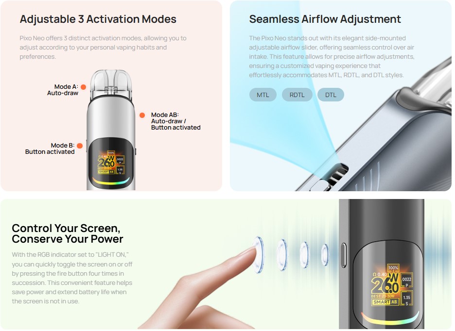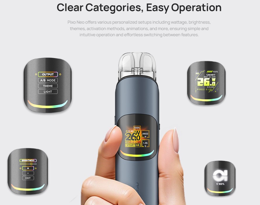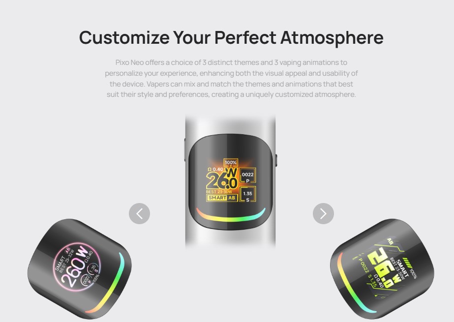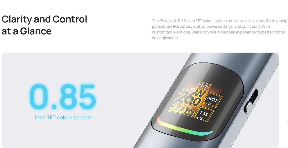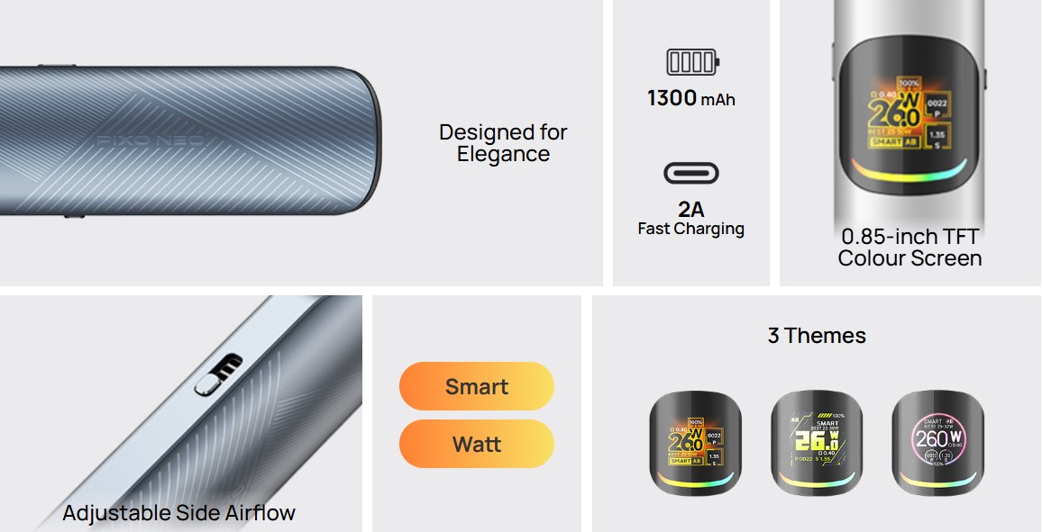 Das Display des Aspire Pixo Neo ist ein bisschen kleiner, bietet aber weiterhin 3 verschiedene Themen für die optische Anpassung. Da der Touch Display nun nicht mehr vorhanden ist, werden alle Einstellungen über den seitlichen Taster getätigt. Wie schon beim Pixo lässt sich auch beim Pixo Neo festlegen, ob man nur die Zugautomatik, nur den Feuertaster oder beides zusammen nutzen will. Auch die Betriebsmodi blieben gleich (Smart und Watt). Im Gegensatz zum Pixo hat der Pixo Neo nur noch einen einfachen Zugzähler. Gleich gelieben ist ebenfalls der seitliche Slider zur Einstellung des Zugwiderstandes.