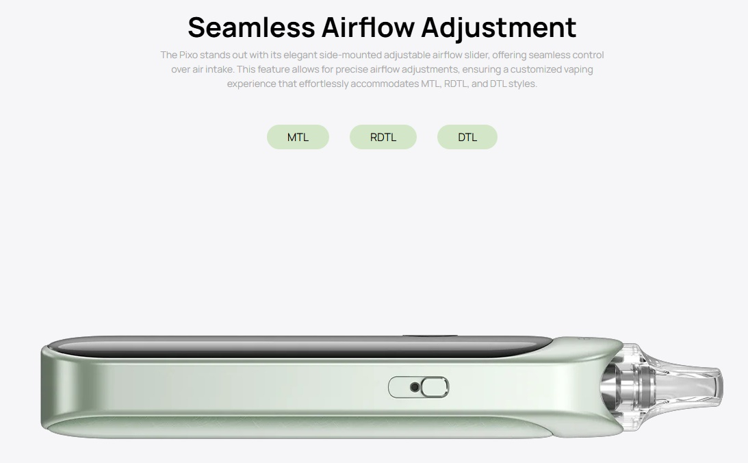 Eine Besonderheit des Aspire Pixo Podsystems ist der Puff Record, welcher die Züge über 7 Tage hinweg aufzeichnet. Damit erhält man einen zusätzlichen Überblick zur Nutzung. Natürlich verfügt der Aspire Pixo auch über einen regulären Puff Counter. Aspire liefert für den Pixo 3 verschiedene Pods mit jeweils 3ml Füllvolumen: den 0,4 Ohm, den 0,6 Ohm und den 1 Ohm. Im Lieferumfang befinden sich der 0,4 Ohm und der 1 Ohm, den 0,6 Ohm kann man separat erwerben. Der Pod lässt sich über die grosszügige Lasche sehr einfach und bequem befüllen. An der Seite des Pixo befindet sich ein Schieber, über welchen man den Zugwiderstand von streng bis offen einstellen kann, dadurch eignet sich der Aspire Pixo sowohl für MTL als auch RDL.