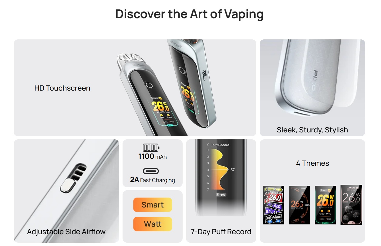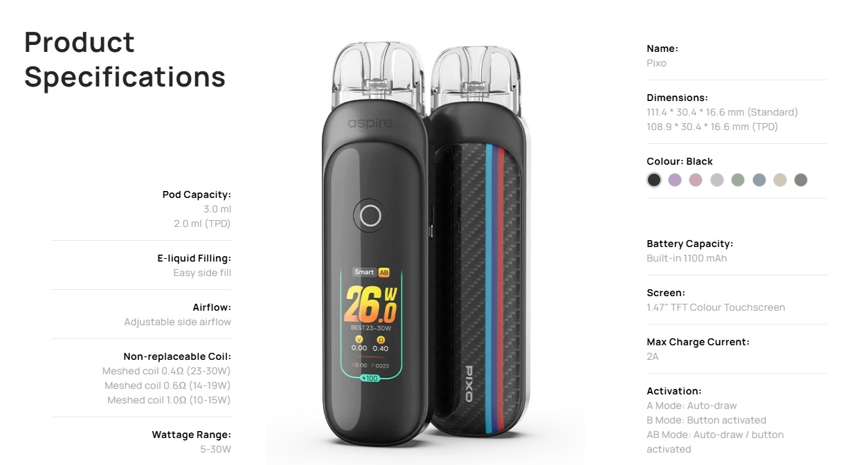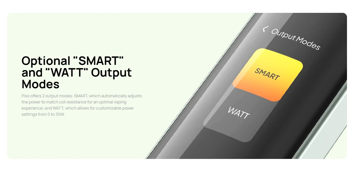 Mit dem Pixo Podsystem hat Aspire ein sehr innovatives Gerät auf den Markt gebracht. Auf den ersten Blick sieht das Aspire Pixo Podsystem aus wie viele andere, doch bei genauerer Betrachtung erkennt man die Unterschiede. So besitzt das Pixo Podsystem ein sensitives Touch Display, welches sehr einfach zu bedienen und vorallem sehr gut reagiert. Wischt man 2 Mal nach unten auf dem Display erscheint die Leistungseinstellung, über welche man die Watt von 5W bis 30W einstellen kann. Nutzt man das System im Smart Modus, dann legt das Gerät jeweils die optimale Leistung automatisch beim einsetzen des Pods fest. Im regulären Watt Modus kann man die Leistung frei einstellen. Wie schon bei anderen Podsystemen aus dem Hause Aspire, lässt sich auch beim Pixo Podsystem festlegen, ob man nur über den taster feuern will oder nur mit der Zugautomatik oder beidem.