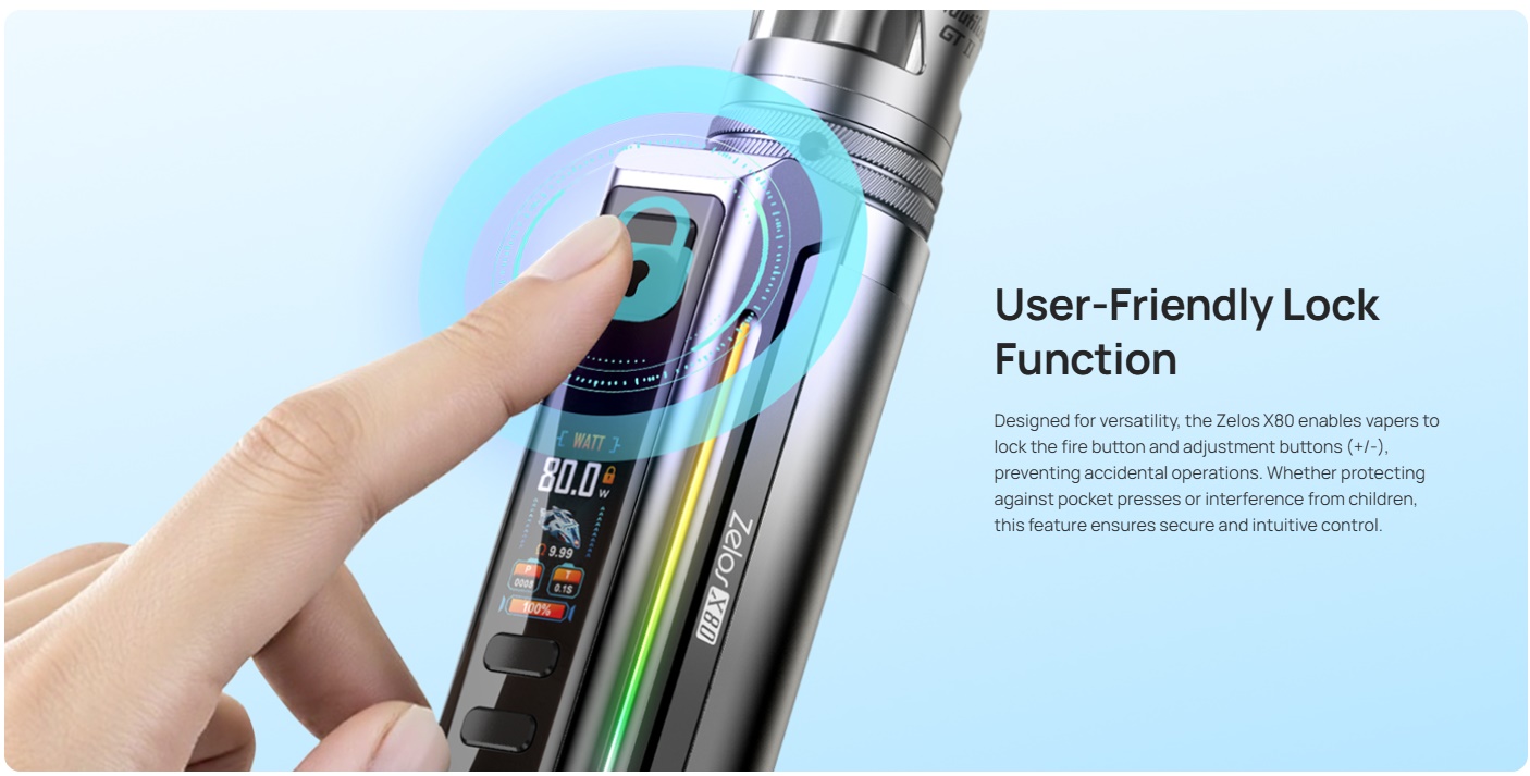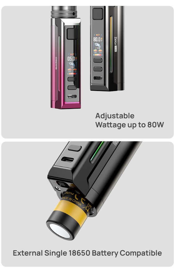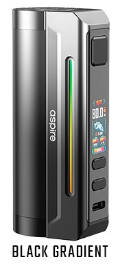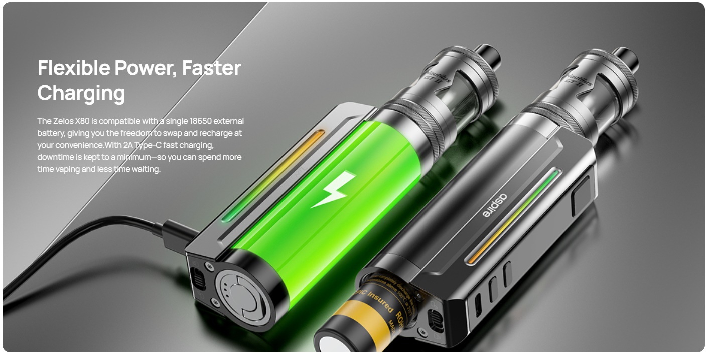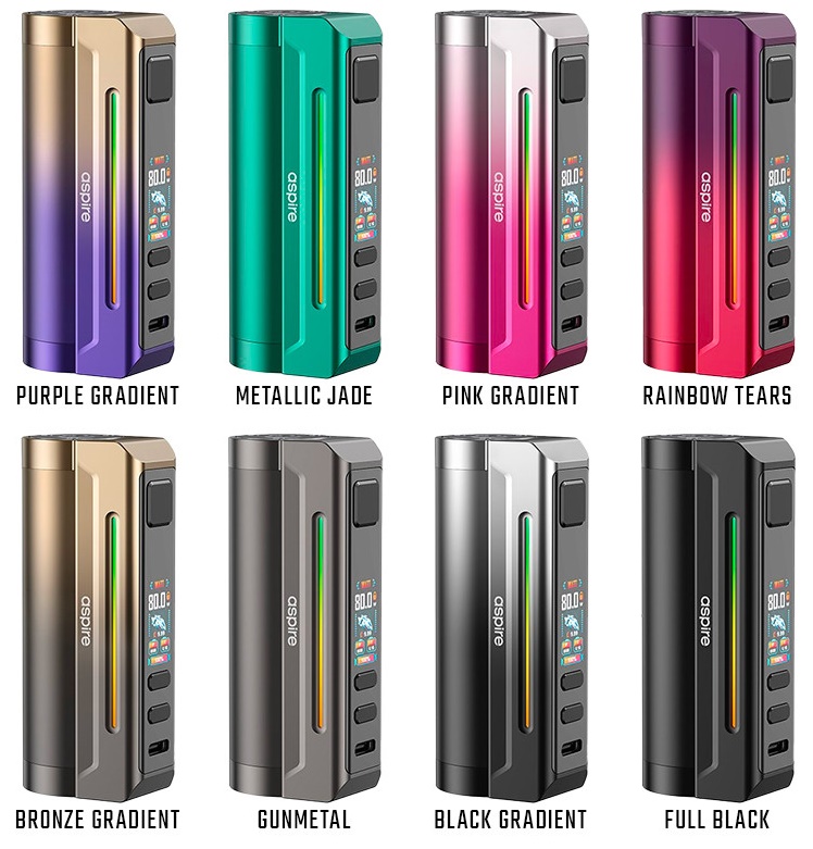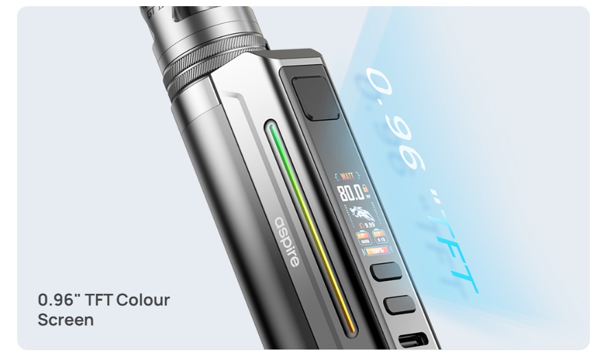Der Aspire Zelos X80 ist der neuste Akkuträger aus der beliebten Zelos-Reihe. Wie schon beim Zelos X benötigt auch der Zelos X80 einen 18650 Akku (nicht inbegriffen). Dieser wird von unten her eingesetzt und durch einen deckel wie schon beim Huracan Akkuträger an seinem Platz gehalten. Der Aspire Zelos X80 liefert im Watt Modus bis zu 80W und verfügt nebst dem reinen Watt Modus auch über Temperaturkontrolle, Bypass, Volt und CPS. Im Gegensatz zum Zelos X besitzt der Zelos X80 ein Farbdisplay, welches den Nutzer über die wichtigen Sachen informiert. Dieses befindet sich an der Front, unterhalb des Feuertasters. Unterhalb des Displays befinden sich die Tasten für Plus und Minus.