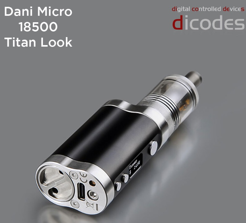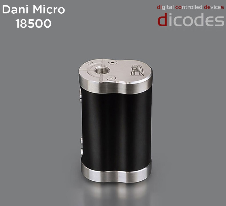 Nach der Dani Micro und der Dani SbS Wireless hat der deutsche Hersteller Dicodes eine noch kleinere Version des Akkuträgers auf den Markt gebracht: die Dicodes Dani Micro 18500. Ausgelegt ist die Dani Micro 18500 für Verdampfer mit bis zu 23mm Durchmesser und benötigt für den Betrieb einen 18500 Akku (nicht im Lieferumfang inbegriffen). Vom Design her orientiert sich die Dani Micro 18500 ganz klar an seinem grossen Bruder, der Dani Micro. Entsprechend befindet sich an der Front ein übersichtliches Display, auf welchem man alle wichtigen Infos wiederfinden kann. Darunter befinden sich die Tasten für Plus und Minus, über dem Display befindet sich der gut erreichbare Feuertaster.
