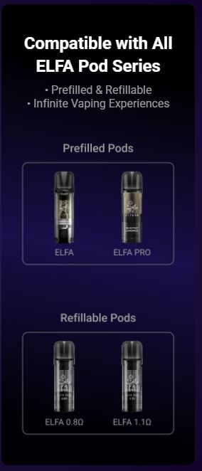 Als Pods können alle bisherigen Elfa Pods genutzt werden, seien es die vorbefüllten oder die wiederbefüllbaren (0,8 Ohm und 1,1 Ohm). Das Elf Bar Elfa Master Kit bietet dem Umsteiger ein einfach handzuhabendes Gerät mit einer Vielzahl von Pods zur Nutzung.