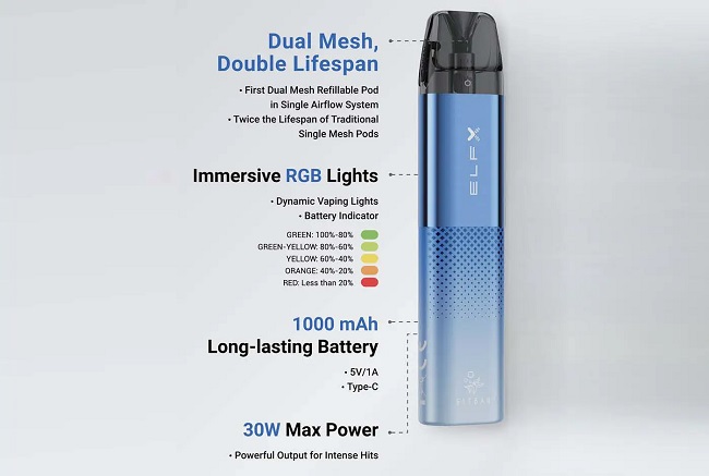 - 1 x ELFX Liquid Pod Dual Mesh 0.8Ω Pod