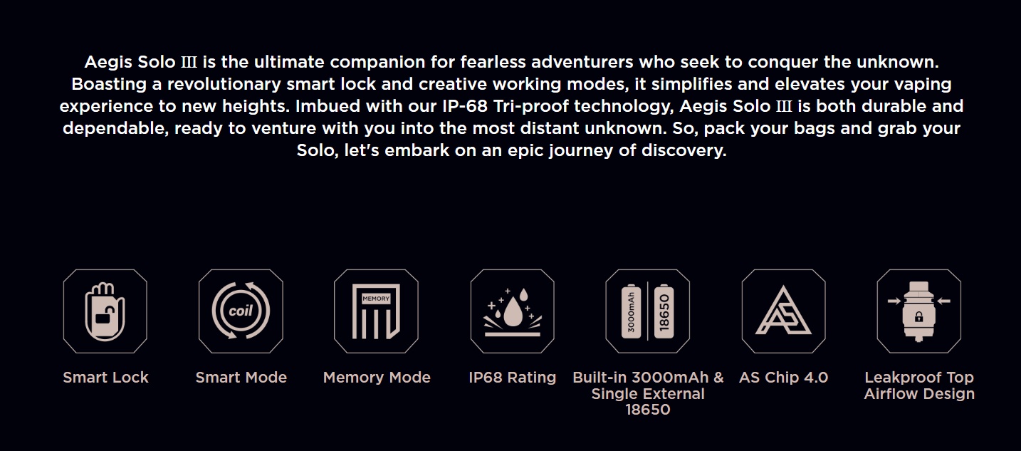 Das Geekvape Aegis Solo 3 Kit ist die neuste Version aus der Aegis Solo Reihe und knüpft nahtlos an den Vorgängern an. Der Aegis Solo 3 Akkuträger besitzt die vom Aegis Legend 3 bekannte Biosensing Technology, welche für eine Sperrung/Entsperrung des Akkuträgers durch Druck sorgt. Der Geekvape Aegis Solo 3 benötigt für den betrieb einen 18650 Akku (nicht inbegriffen), damit lässt sich im Wattmodus eine Leistung von bis zu 100W abrufen. Nebst dem Wattmodus verfügt der Akkuträger auch über einen Smart Modus, Memory, Boosting Modus und TCR. Natürlich ist auch der Aegis Solo 3 widerstandsfähig und dank IP68 Zertifizierung vor den meisten Umwelteinflüssen geschützt. An der Oberseite des Akkuträgers befindet sich der geschützte USB Type-C Anschluss, über welchen man den Akkuträger auch laden kann (wir empfehlen jedoch die Nutzung eines externen Ladegerätes).