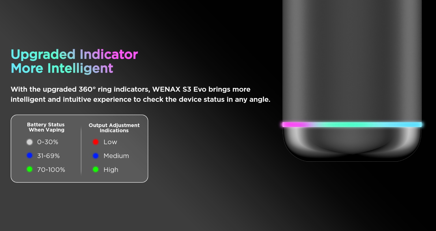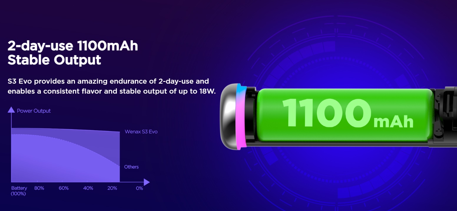 Der Geekvape Wenax S3 Evo besitzt 3 Leistungsstufen (Low, Medium und High), welche man über den Taster an der Unterseite einstellen kann. Dort befindet sich auch der LED Indikator für den Akkustand. Eine Besonderheit des Wenax S3 Evo ist der Boost Mode: durch drücken des Tasters während des Zuges gibt das Gerät die maximale Leistung ab. Der Akku des Wenax S3 Evo misst 1100mAh und wird über den USB Type-C Anschluss geladen.