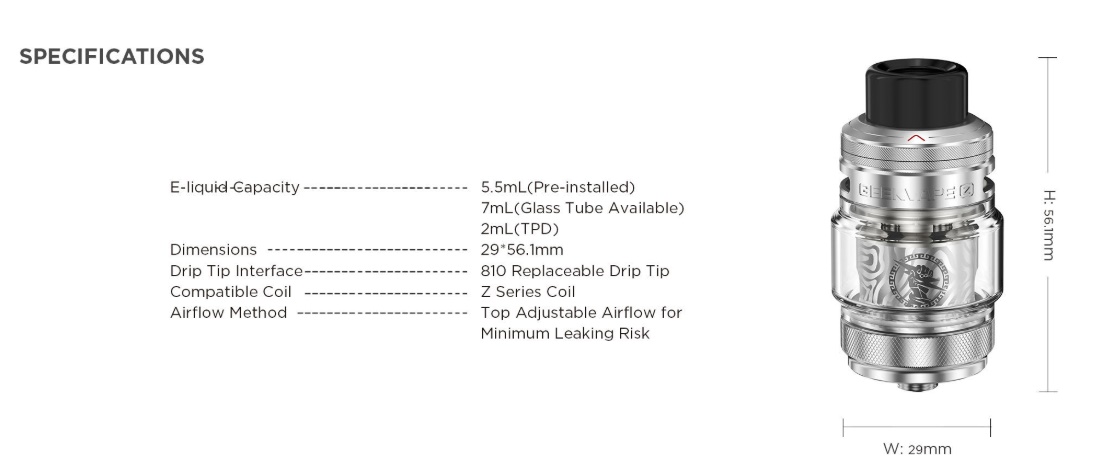 Der Geekvape Z Subohm Tank 5 ist die neuste Version des sehr beliebten Zeus Subohm Tanks. Während Geekvape das Grundkonzept des Top Airflow Tankes beibehalten hat, wurde der Z Subohm Tank 5 in Details verbessert. So besitzt der Tank nun Top zum aufschieben, um an die Füllöffnung zu gelangen. Wie schon der Vorgänger hat auch der Z Subohm Tank 5 ein Füllvolumen von 5,5ml mit dem Bubble Glass. Wie bei den Vorgängern kommen auch beim neusten Z Subohm Tank die bekannten Z-Coils zum Einsatz.