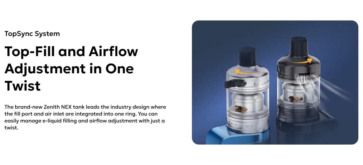 Der Innokin Zenith NEX ist der neuste Tank aus der Zenith-Reihe und der erste mit einer Top Airflow. Der Zenith NEX hat einen Durchmesser von 26mm (unbedingt nachmessen, ob er auf Akkuträger passt) und ein Füllvolumen von 5ml. Um an die Füllöffnung zu gelangen, muss man die Airflow Control im Uhrzeigersinn drehen, dann erscheint der Silikonverschluss und darunter befindet sich die grosszügige Füllöffnung. Der Innokin Zenith NEX eignet sich dank des einstellbaren Airflows für MTL bis RDL.