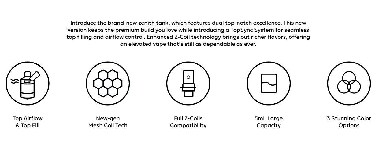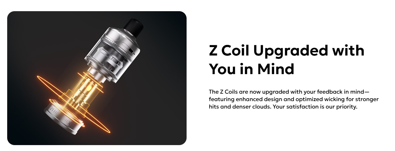Natürlich ist der Zenith NEX zu allen bisher erschienenen Z-Coils kompatibel. Diese werden wie bei den früheren Zenith-Tanks einfach von unten her eingesteckt. Durch die grosse Auswahl an Widerständen von 0,3 Ohm bis 1,6 Ohm lässt sich der Zenith NEX für ein breites Spektrum von MTL bis RDL einsetzen.