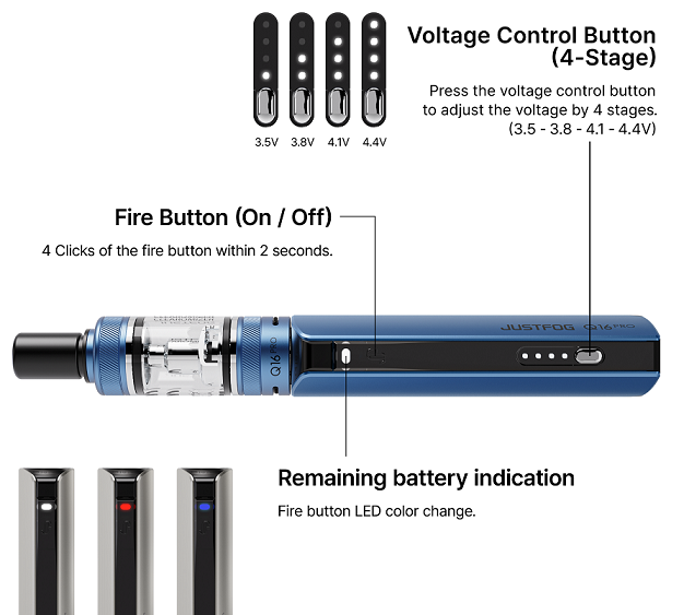 Auch der Akkuträger mit 900mAh im neuem Design wirkt etwas schnittiger und eleganter. Die Leistung wird neu mit einer 4 Punkte-LED Anzeige eingestellt (3.5, 3.8, 4.1 und 4.4Volt). Die integrierte LED Leuchte im Feuerknopf zeigt den Akkustand mittels weisser, blauer oder roter Leuchte präzise an. Zudem lässt sich der Akkuträger mit dem beiliegenden USB Ladekabel in etwa 45 Minuten wieder aufladen. Selbstverständlich ist das Justfog Q16 Pro Set mit sämtlichen Schutzvorrichtungen wie Kurzschlussschutz, Temperaturschutz, Überhitzungsschutz, Überspannungsschutz und Überladungsschutz für sicheres Dampfen ausgerüstet. Auch können mit dieser E-Zigarette hoch dosierte Liquids mit Nikotin Salz gedampft werden. Ähnlich wie die POD-Systeme aber mit dem grossen Vorteil das die bevorzugten Einstellungen angepasst werden können und Sie absolut frei in der Wahl Ihres bevorzugten E-Liquids sind.