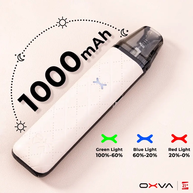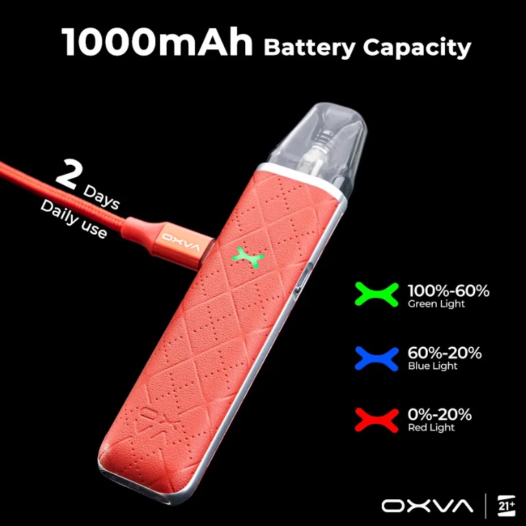 Der 1000mAh Akku des Oxva Xlim Go lässt sich über den seitlichen USB Type-C Anschluss mit 1A/5V laden. Den aktuellen Akkustand kann man über den LED Indikator an der Front ablesen. Eine Besonderheit am Xlim Go ist die lederähnliche Textur, welche einen ausgezeichneten Grip gewährt.