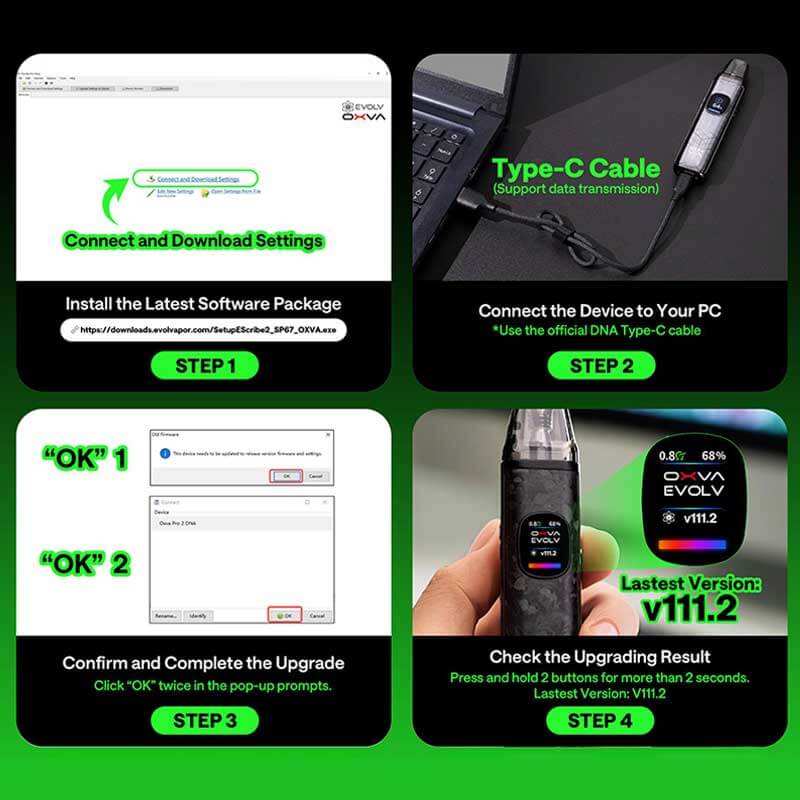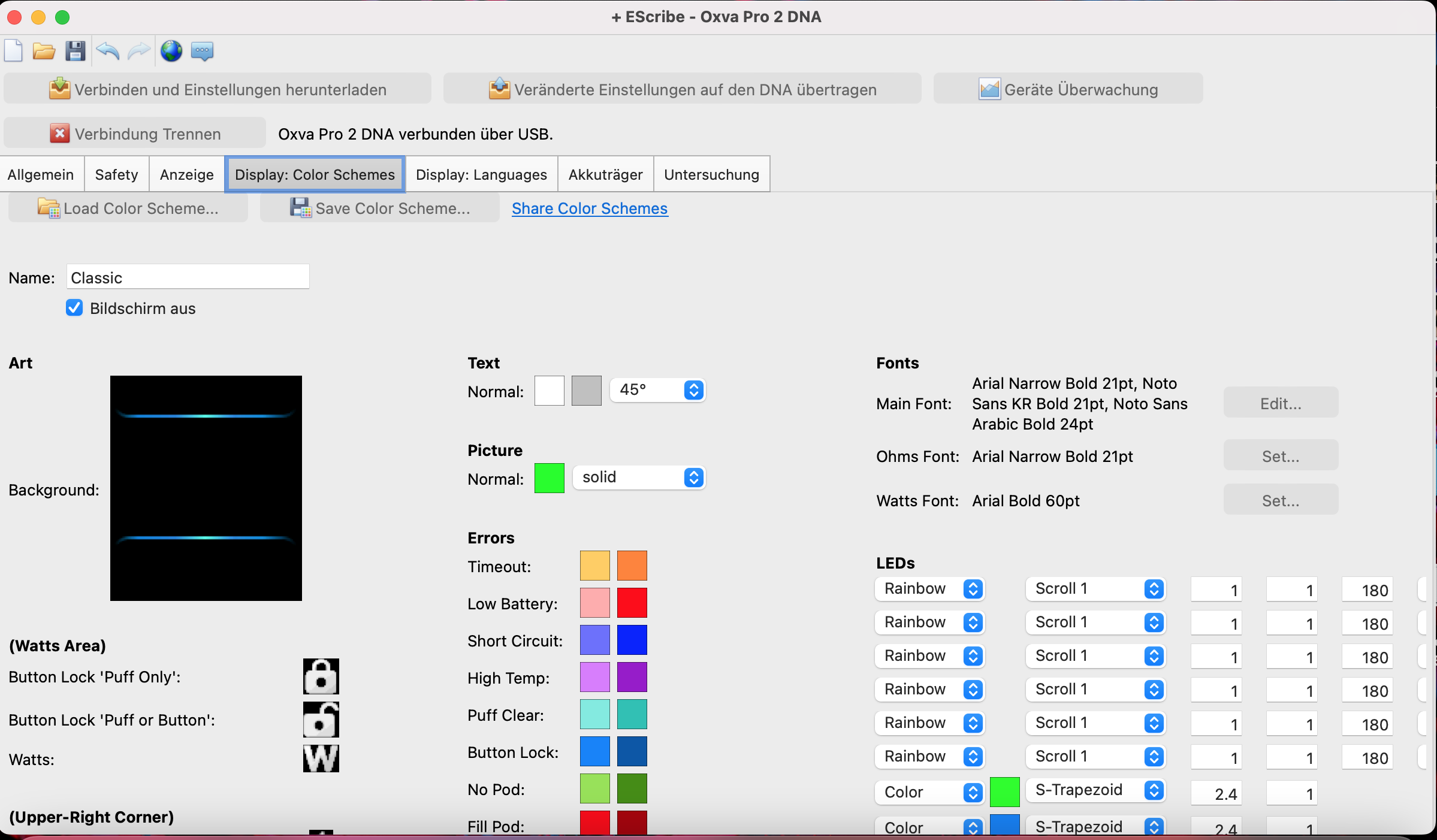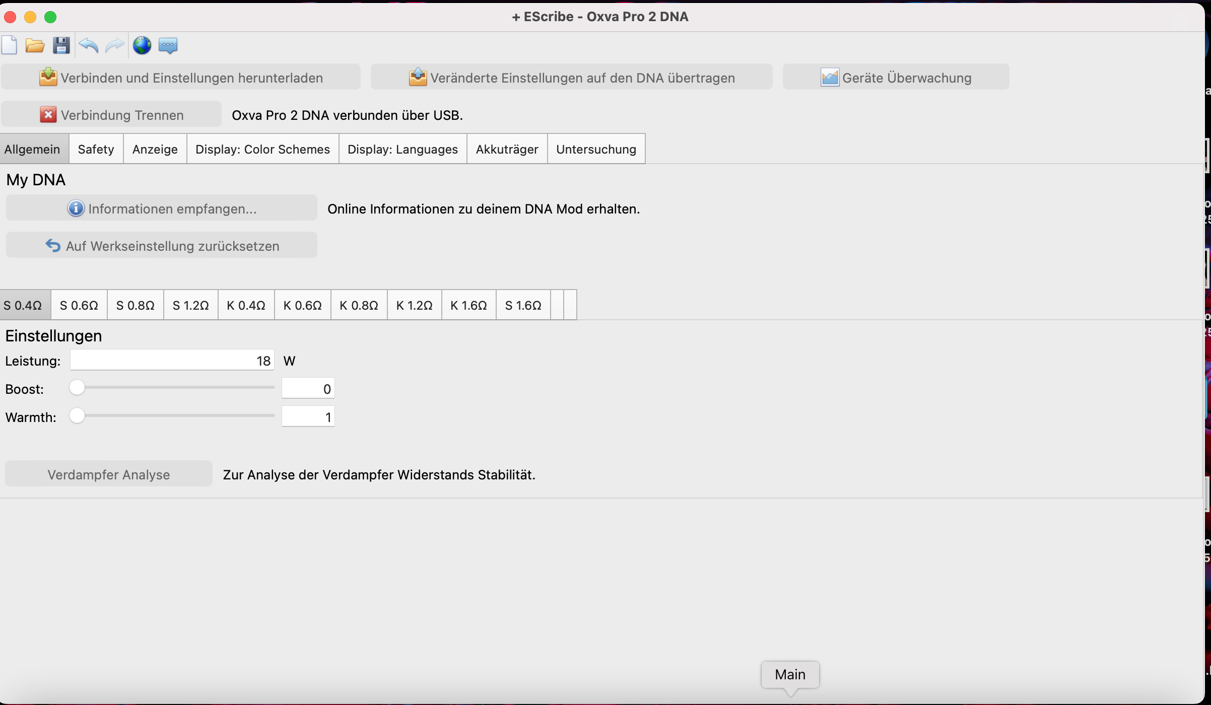 Über die Software Escribe (es gibt eine spezielle Version nur für den Oxva Xlim Pro 2 DNA, diese ist jedoch nur für Windows verfügbar) lassen sich auch am Oxva Xlim Pro 2 DNA jede Menge Einstellungen vornehmen, so wie man es auch von anderen Geräten mit DNA Chip kennt. Bei den neuen SS Pods lässt sich zum Beispiel der Boost festlegen. Auch optisch bietet Escribe sehr viele Möglichkeiten, wie die Anpassung der Farben oder die Sprache.