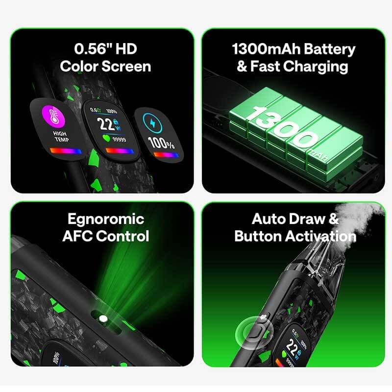 Mit nur 114,5 × 25 × 15 mm und einem Gewicht von 67 g liegt das Gerät besonders angenehm in der Hand und ist ideal für unterwegs. Wähle aus vier eleganten Designs aus Zink-Legierung oder setze mit der coolen Carbon-Version echte Akzente – für jeden Style das passende Pod System!