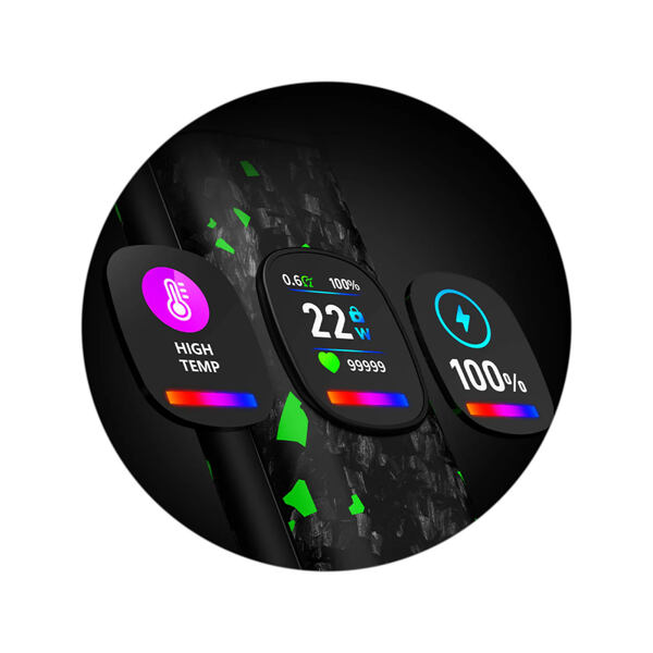Das 0.56-Zoll Farbdisplay zeigt alle wichtigen Infos übersichtlich an, darunter Akkustand, Leistung, Puff-Zähler und Coil-Widerstand. Die stylische LED-Leiste unter dem Display bietet frei wählbare Farben und optisches Feedback. Über die Evolv Escribe Software lassen sich Display und LEDs individuell konfigurieren.
