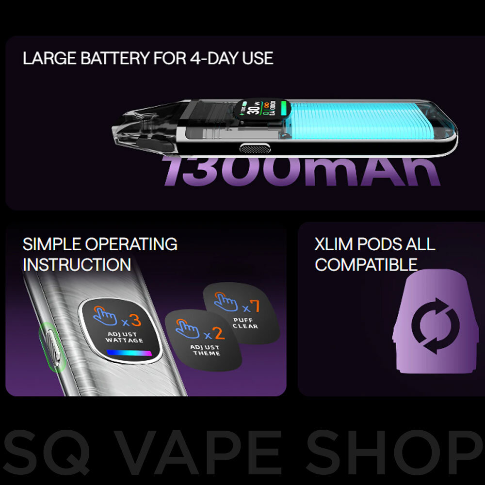 Das Xlim Pro 2 Kit ist mit einem leistungsstarken, integrierten 1300mAh-Akku ausgestattet, der eine beeindruckende Leistung von bis zu 30W ermöglicht. Dank des intelligenten Chipsatzes passt das Gerät die Leistung automatisch an die verwendete Kartusche an, wodurch Optimierung und Effizienz gewährleistet sind. So geniessen Sie jeden Zug in perfekter Anpassung an Ihre Vorlieben.