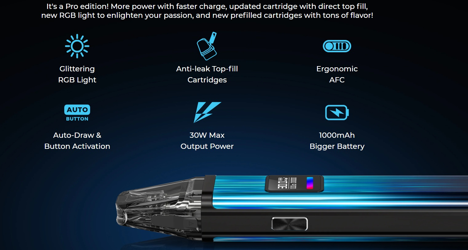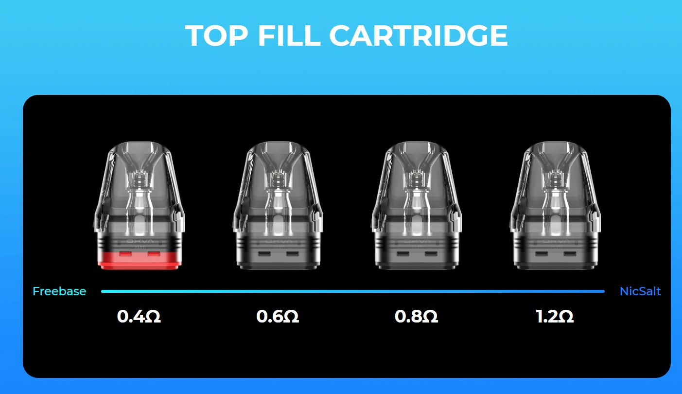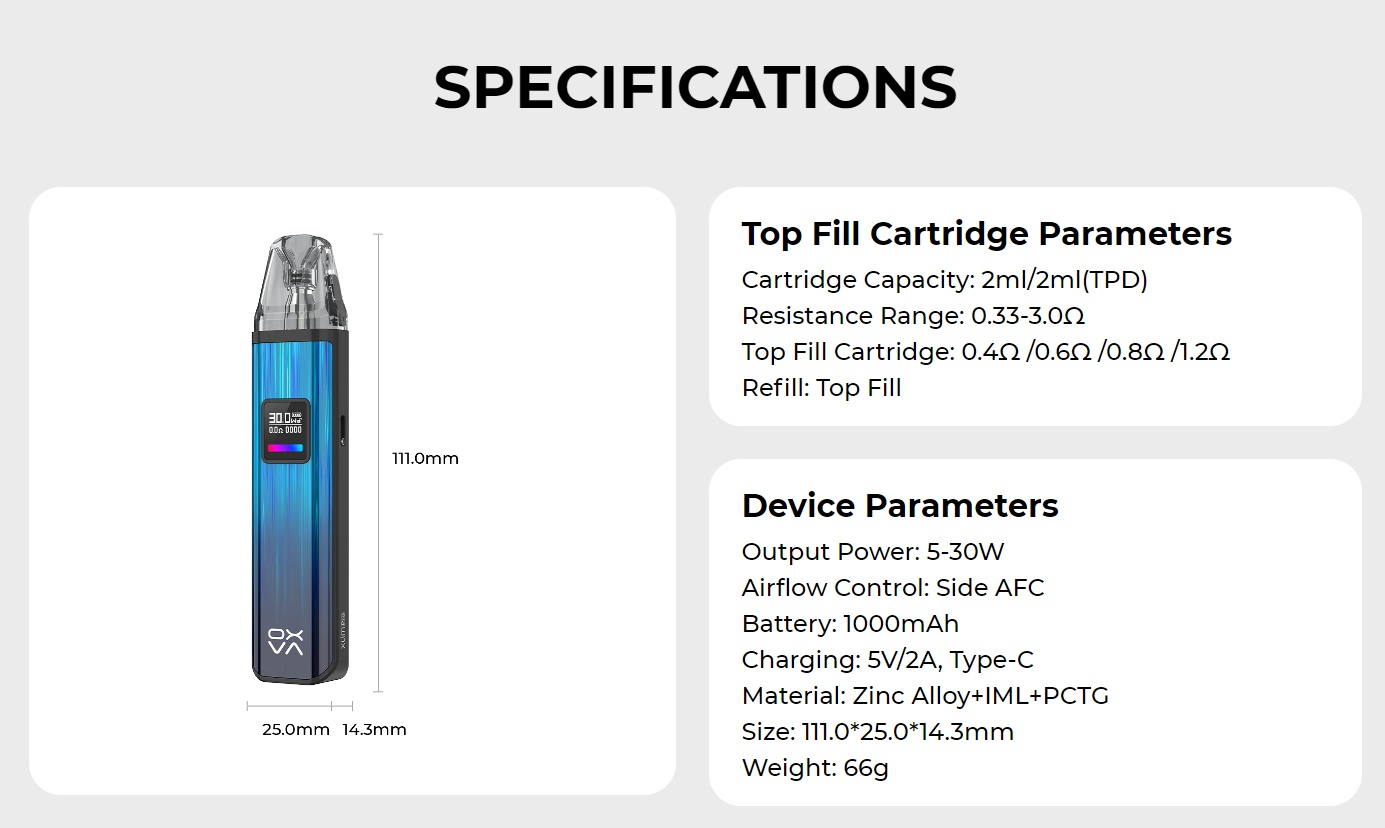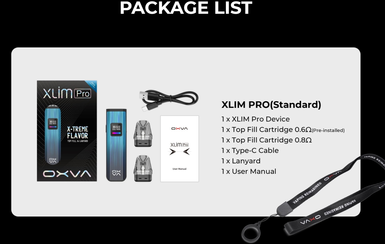 Der Oxva Xlim Pro Pod ist das Topmodell aus der Xlim-Reihe und bietet einige interessante Features. Im Vergleich zum Vorgänger wurde der Akku auf 1000mAh vergrössert und dank des USB Type-C Anschlusses lässt er sich mit einem Ladestrom von 2A/5V zügig wieder aufladen. Ebenfalls neu sind die Pods, welche nun in der Version 3 daherkommen. Musste man die V2 Pods noch aus dem Gerät nehmen zum auffüllen, so können die V3 Pods im Gerät steckenbleiben und bequem über den Fill Port am oberen Seitenrand befüllt werden. Die Widerstände sind gleich geblieben, auch die V3 Pods gibt es mit den Widerständen 0,6 Ohm, 0,8 Ohm und 1,2 Ohm. Natürlich können auch die V2 Pods im Xlim Pro genutzt werden.