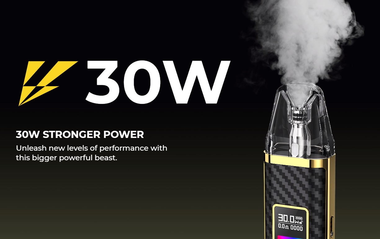 An der Front befindet sich das übersichtliche Display, welches die jeweils eingestellte Leistung anzeigt. Auch bei der Leistung legte Oxva noch ein bisschen drauf, denn der Oxva Xlim Pro liefert nun bis zu 30W. Wie schon beim Xlim Pod lässt sich der Feuertaster sperren, so dass man dann nur noch die Zugautomatik nutzen kann. An der Unterseite des Displays befindet sich noch ein RGB Lichtspiel, dieses lässt sich jedoch auch deaktivieren. Den Airflow kann man wie beim Xlim C und Xlim Pod über den seitlichen Slider einstellen.