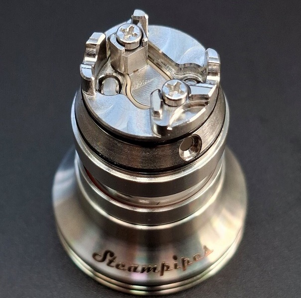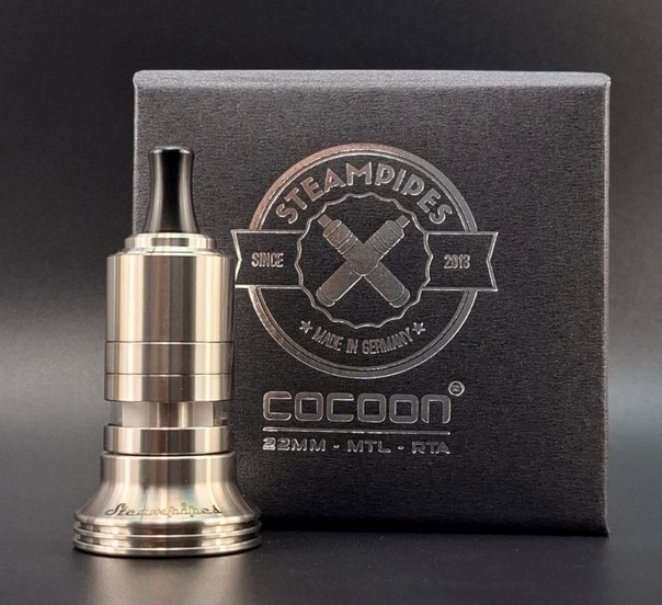 Der Steampipes Cocoon 22mm MTL RTA ist der neuste Verdampfer des deutschen Herstellers Steampipes. Der Tradition des Corona und Cabeo folgend, handelt es sich auch beim Cocoon RTA um einen Topcoiler. Das Deck des Verdampfers ist ausgelegt für die Nutzung einer Single Coil, wobei das Postsystem eine einfache Platzierung erlaubt. Der Cocoon 22mm MTL RTA eignet sich für MTL bis Open MTL, wobei der Zugwiderstand über Luftschrauben festgelegt wird, ähnlich dem Cabeo. Man kann die Luft entweder nur von einer Seite oder von zwei Seiten die Coil umströmen lassen.