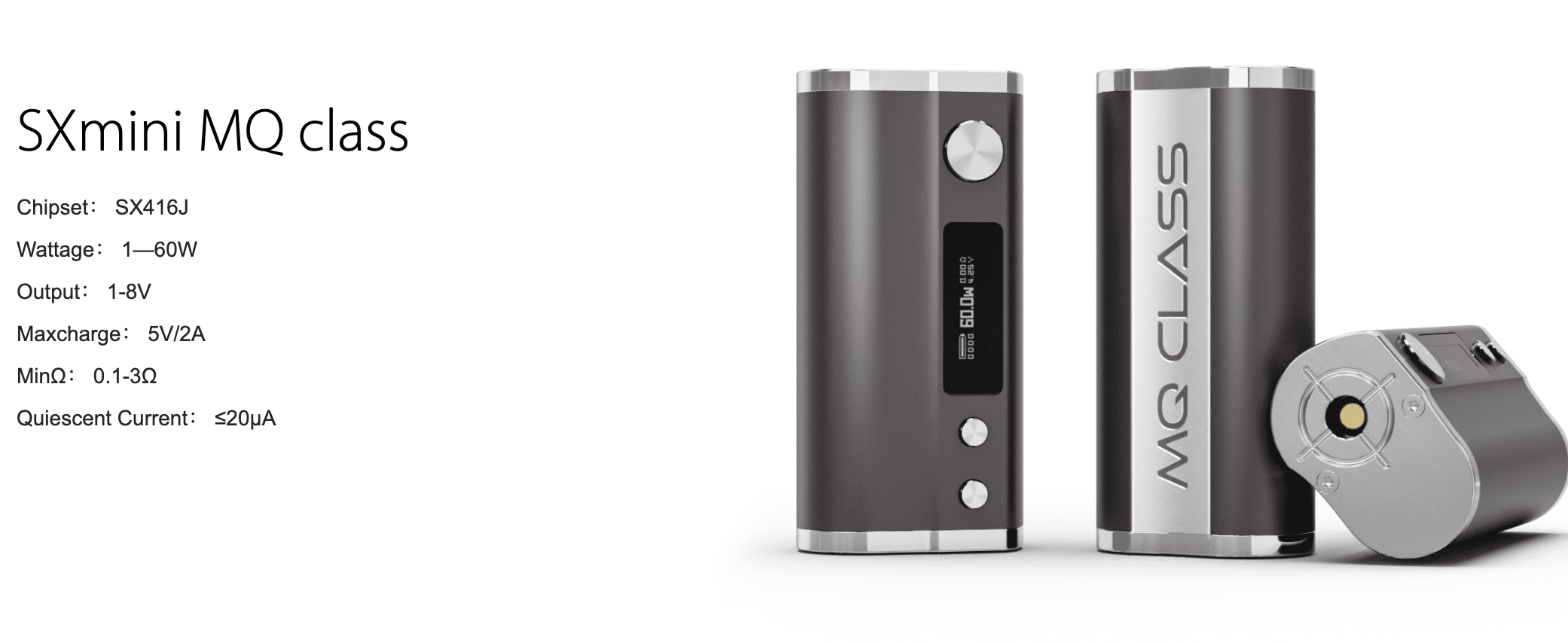 Im SxMini MQ Class kommt der Yihi SX416J Chip zum Einsatz. Dieser wurde so beschichtet, dass er wasserabweisend ist und man auch bei einem siffenden Verdampfer keine Angst haben muss, dass der Akkuträger gleich stirbt. Im Gegensatz zu früheren Yihi Chipsätzen besitzt der SX416J ein einfaches einfarbiges Display. Zudem kommen als Betriebsmodi nur Watt, Volt Temperaturkontrolle und Curve zum Einsatz. Stand bei früheren Yihi Chips das "J" im Namen normalerweise für "Joystick", so besitzt der SxMini MQ Class über klassische Tasten für Plus und Minus.