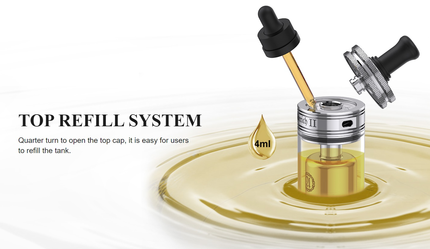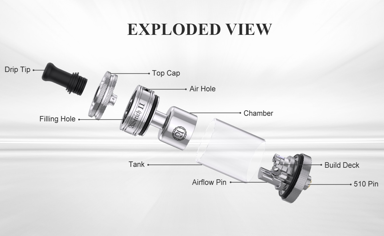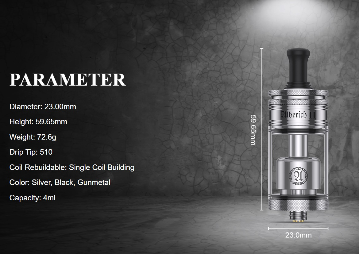 Der Vapefly Alberich 2 MTL RTA ist der Nachfolger des Alberich MTL RTA, wobei man einige der Verbesserungen schon auf den ersten Blick erkennt. Der offensichtlichste Unterschied zum Vorgänger liegt in der Airflow, denn der Alberich 2 RTA besitzt nun einen leak-freien Top Airflow. Gleich geblieben ist das Top Filling mit Bajonettverschluss, dadurch lässt sich der Vapefly Alberich 2 MTL RTA sehr einfach und bequem wieder befüllen. Während der Vorgänger noch zwei verschiedene Tankvolumen hatte, je nach verwendetem Tankglas, besitzt der neue Alberich 2 nur noch eins und zwar 4ml.