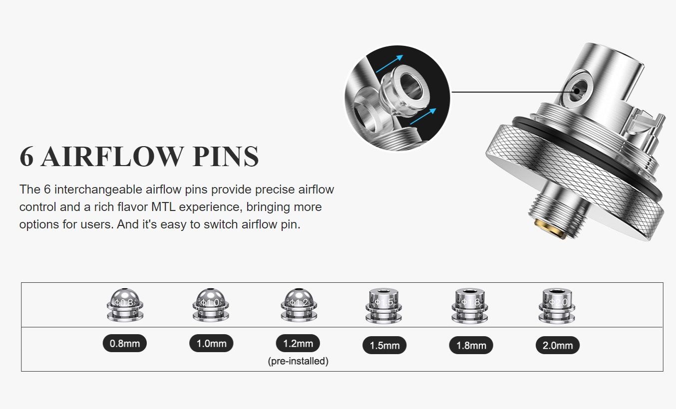 - 6 verschiedene Airflow Pins: 0,8mm, 1,0mm, 1,2mm (vorinstalliert),