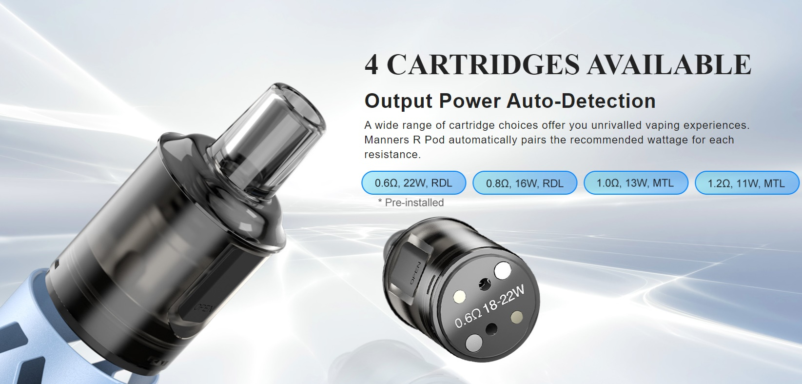 - 4 verschiedene Pods verfügbar: 0,6 Ohm (vorinstalliert)