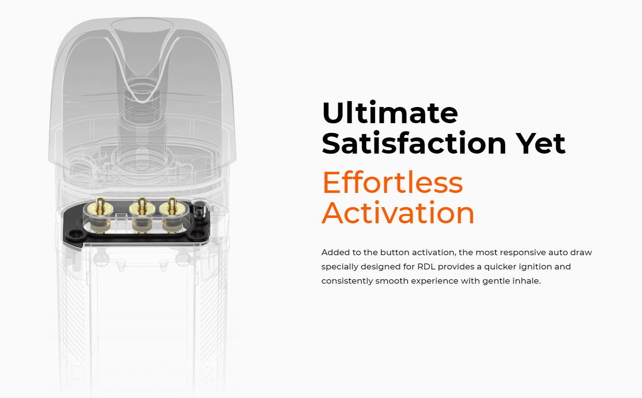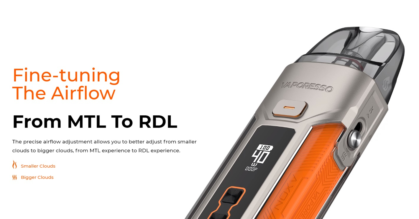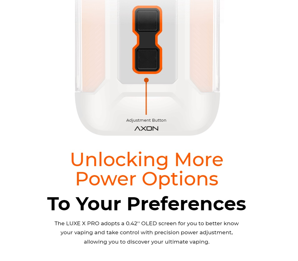 Der Luxe X Pro bietet eine einstellbare Leistung bis 40W, dazu befinden sich die tasten für Plus und Minus an der Frontseite unterhalb des Displays. Ebenfalls einstellen lässt sich der Zugwiderstand über den Schieber an der Seite. So ist es nicht mehr nötig, dass man jeweils den extra Pod für MTL/RDL/DL nutzt. Das 0,42" grosse OLED Display an der Front informiert den Nutzer jeweils über den Akkustand, die eingestellte Leistung und den aktuellen Widerstand.