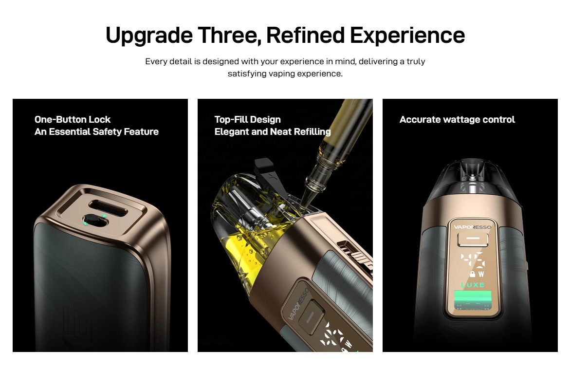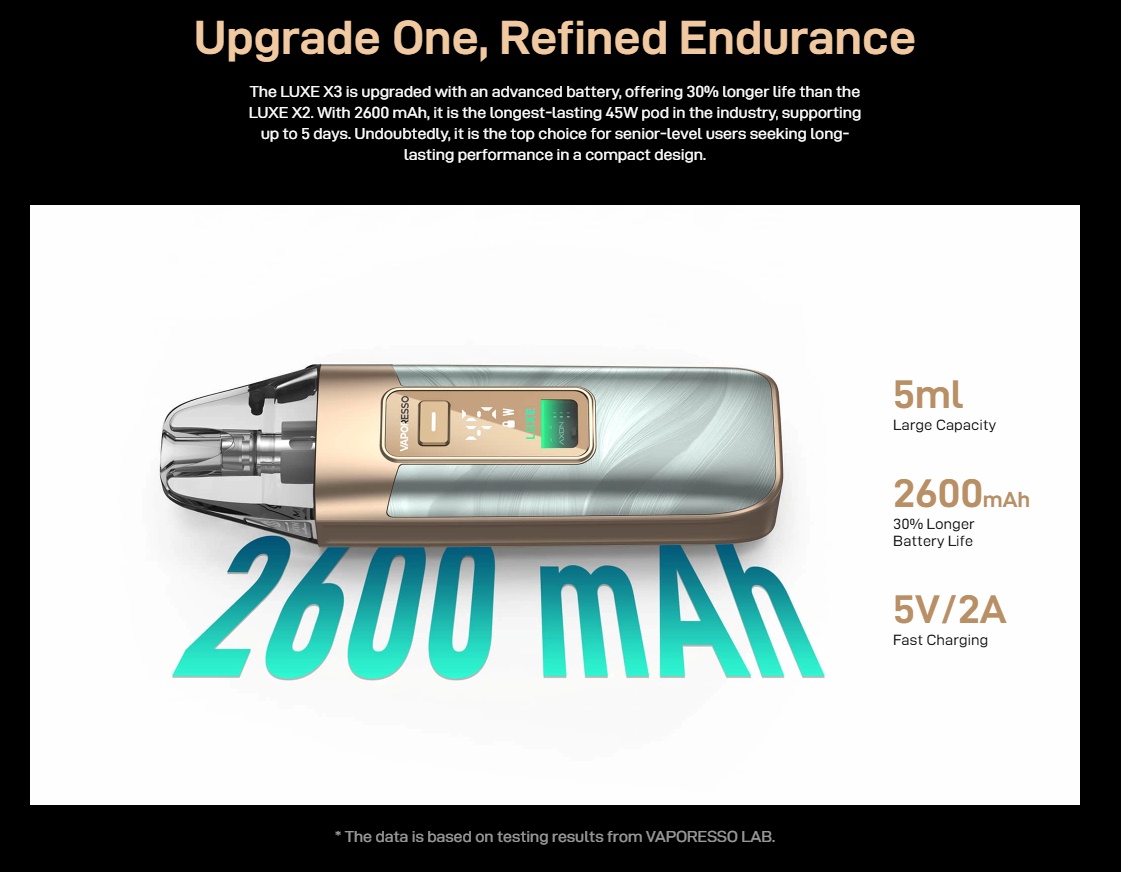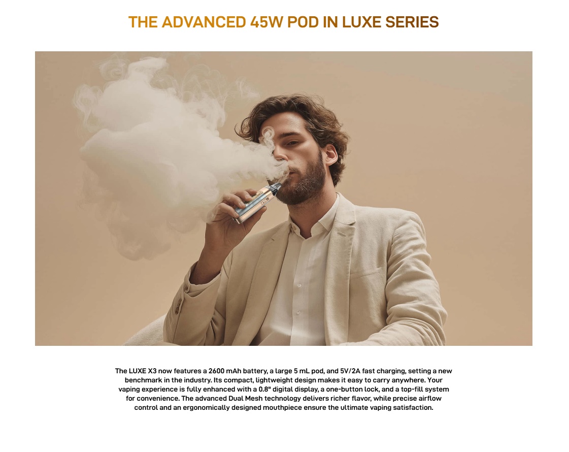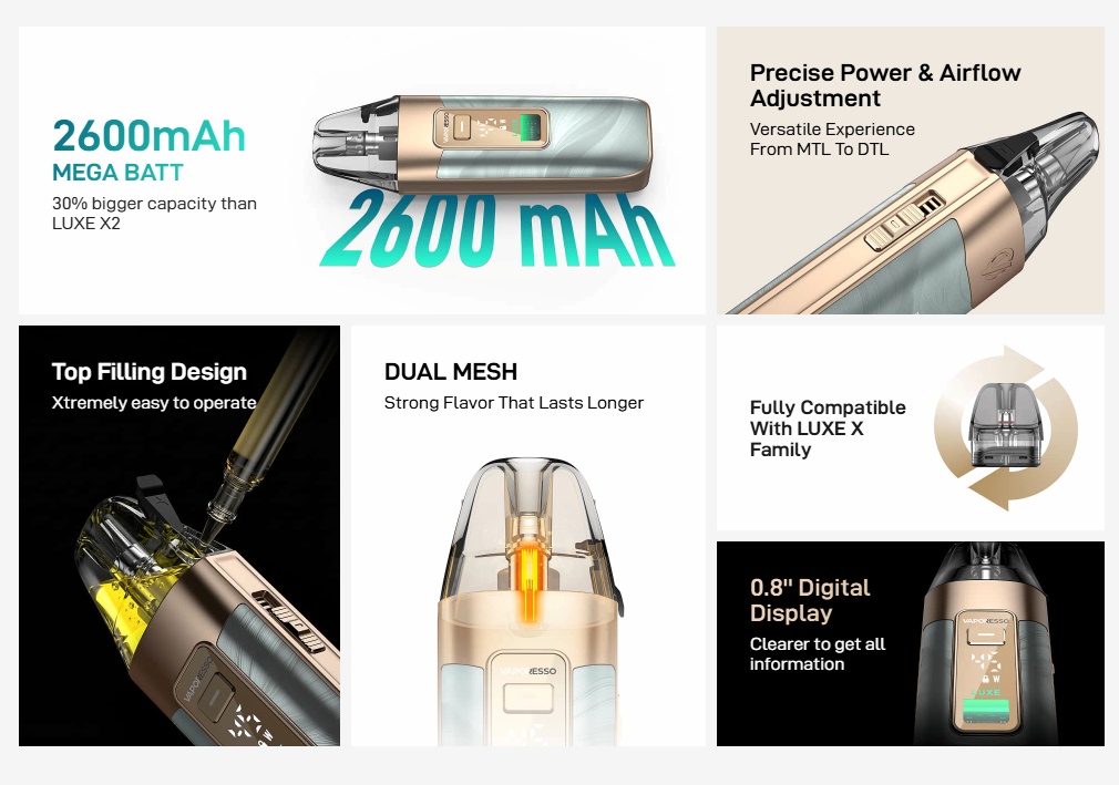 Der Vaporesso Luxe X3 ist der Nachfolger des Luxe X2, wobei Vaporesso den Luxe X3 in 3 Bereichen verbessert hat. Der neue Vaporesso Luxe X3 besitzt einen Akku mit 2600mAh und kann über den USB Type-C mit 2A/5V geladen werden. Eine Neuerung beim Luxe X3 sind die Pods, denn diese sind nun erstmals als Dual-Mesh erhältlich und besitzen eine neue Form des Mundstückes, welches angenehmer sein soll. Gleich geblieben ist das Füllvolumen von 5ml, doch während man die bisherigen Luxe X Pods von unten befüllen musste, können die neuen Dual-Mesh Pods oben an der Seite befüllt werden. Natürlich können auch weiterhin alle bisherigen Luxe X Pods genutzt werden.