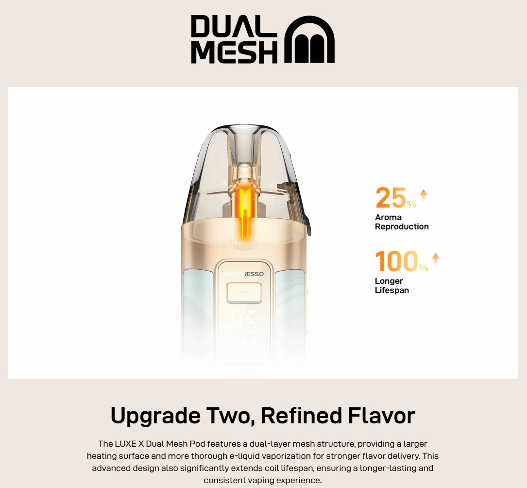 - 1x Luxe X 0,4 Ohm Dual-Mesh Pod