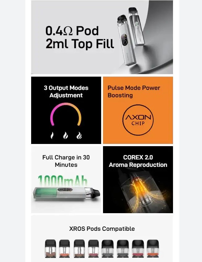 Der Xros 4 beeindruckt nicht nur durch sein Design, sondern auch durch seine Leistung. Ausgestattet mit dem leistungsstarken Axon-Chip, der im Pulse-Modus arbeitet, profitieren Sie von einer konstanten Leistung und einem hochwertigen Dampferlebnis während der gesamten Batterielaufzeit. Genießen Sie die einfache Handhabung: Der Pod erfordert keine komplizierten Einstellungen, bietet Ihnen jedoch die Möglichkeit zur Personalisierung.