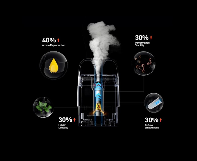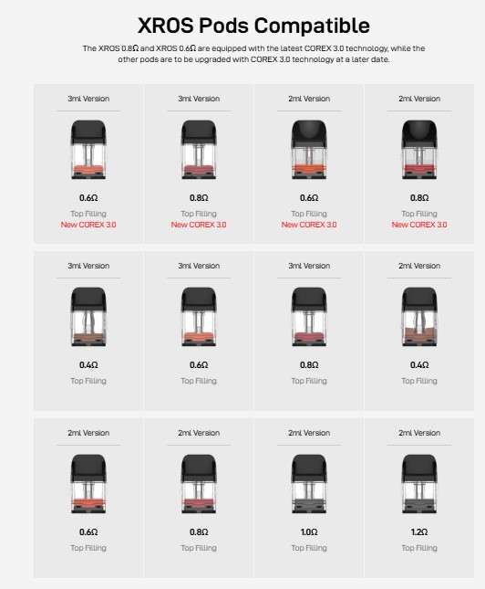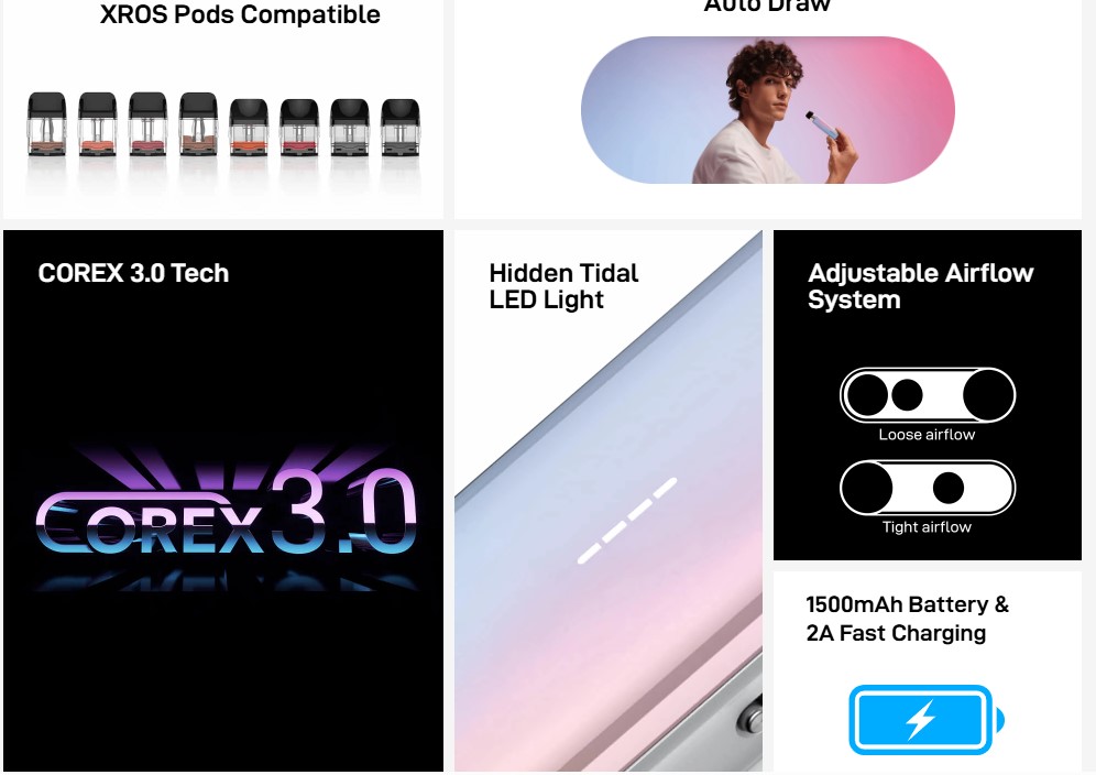Gleich gelieben ist die ergonomische Form und der seitliche Slider für die Airflow. Über diese lässt sich der Zugwiderstand stufenlos einstellen. Mit der Xros 5 Reihe hat Vaporesso auch gleich die Corex 3.0 Pods auf den Markt gebracht, welche kleine Detailverbesserungen im Vergleich zu den Corex 2.0 mit sich bringen.