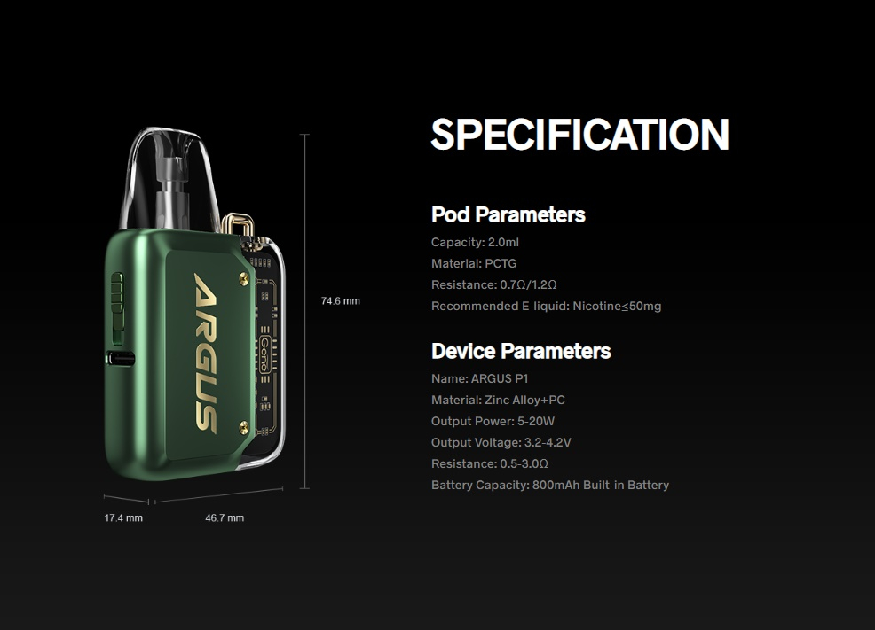 - kompatibel mit Argus Pods (0,7 Ohm/1,2 Ohm)