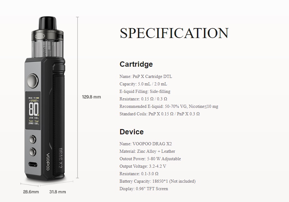 Als Akku benötigt der Voopoo Drag X-2 einen 18650 Akku (nicht inbegriffen), damit lässt sich eine Leistung von bis zu 80W abrufen. Im Gegensatz zum alten Drag X wird der Akku nun nicht mehr von unten eingesetzt. Der Drag X-2 besitzt nun ein C-Frame Design, somit lässt sich der Akkudeckel nach hinten abziehen und ermöglicht dann den Akku einzusetzen. Der Akkudeckel ist mit einem veganen Lederimitat versehen, was ein sehr angenehmes Handling ermöglicht. An der Frontseite befinden sich nebst dem Display auch die Tasten zum feuern und zum einstellen der Leistung. Unterhalb der Tasten für Plus/Minus befindet sich der USB Type-C Anschluss, über welchen man den Akkuträger laden könnte. Wir empfehlen jedoch die Nutzung eines externen Ladegerätes.